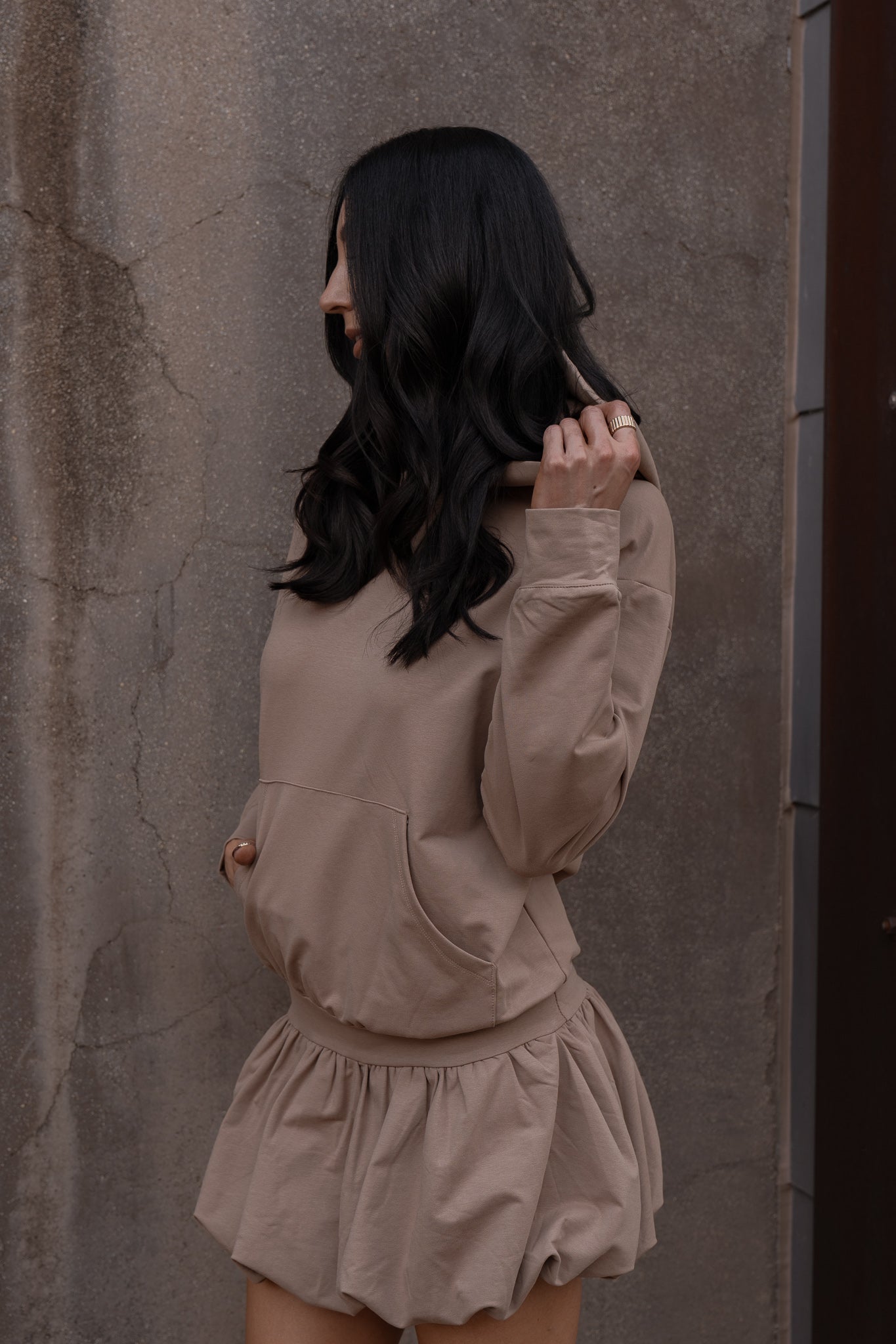 A casual silhouette meets a playful twist in this bubble-hem hoodie dress. Designed with a relaxed fit, long sleeves, and a classic front pocket, it blends comfort with a fresh, modern shape. The elastic waist creates a voluminous bubble skirt that adds movement and style to your everyday lineup.