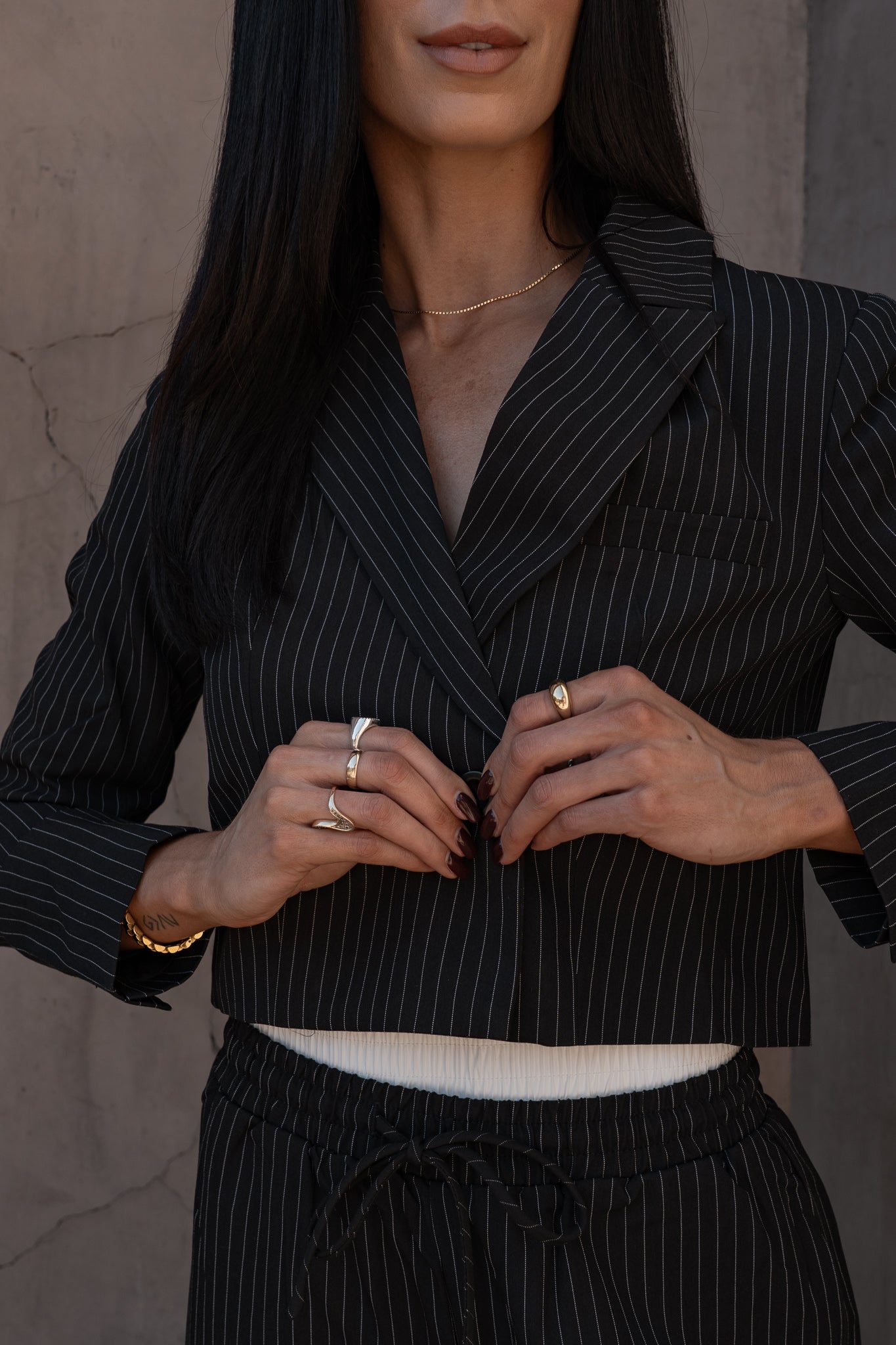 Elevate your wardrobe with the Ella Cropped Pinstripe Blazer, featuring a sharp, tailored fit and timeless pinstripe detail. Its cropped length adds a modern edge, perfect for pairing with the matching double-layer pinstripe pants to create a cohesive, sophisticated look that commands attention in any setting. Crafted to blend style and confidence seamlessly, this blazer is essential for a polished finish.