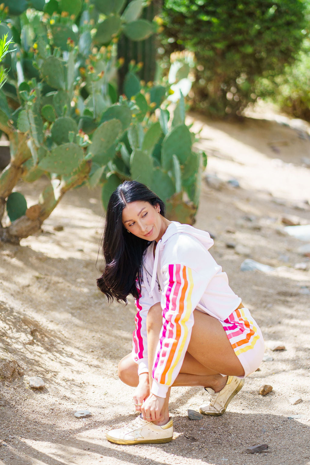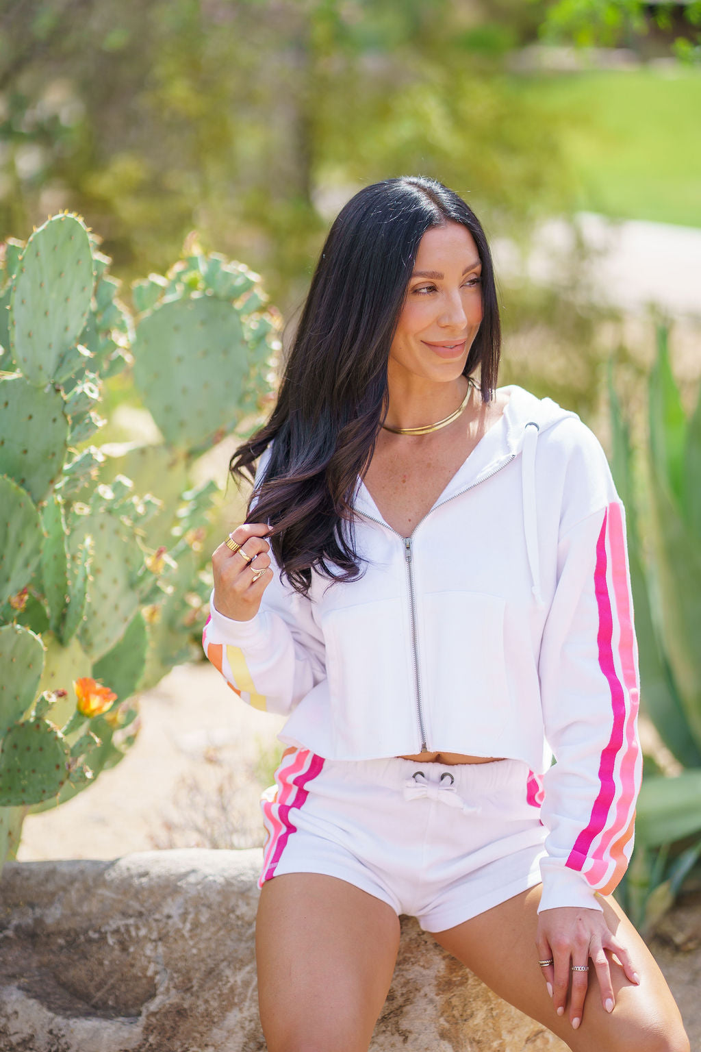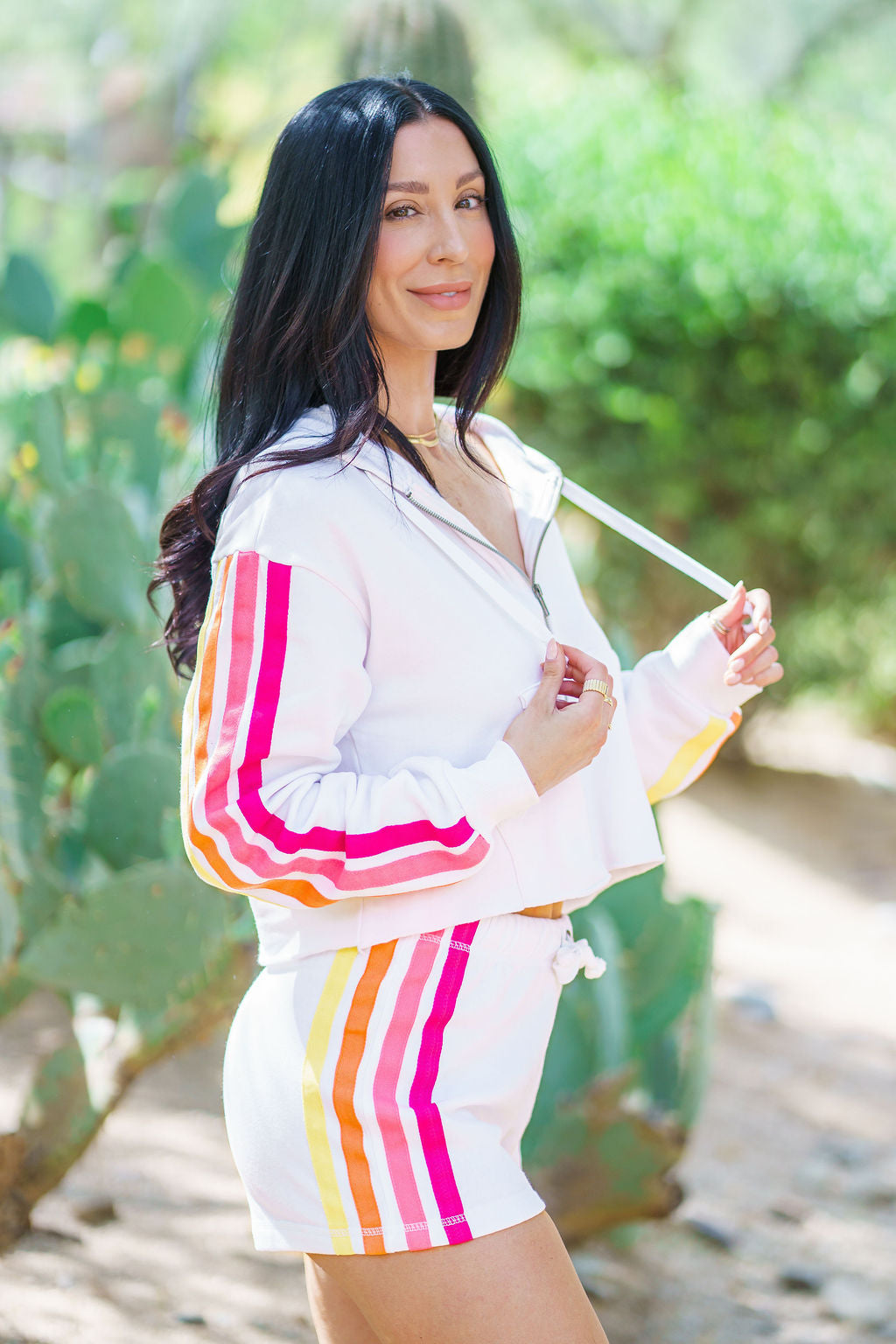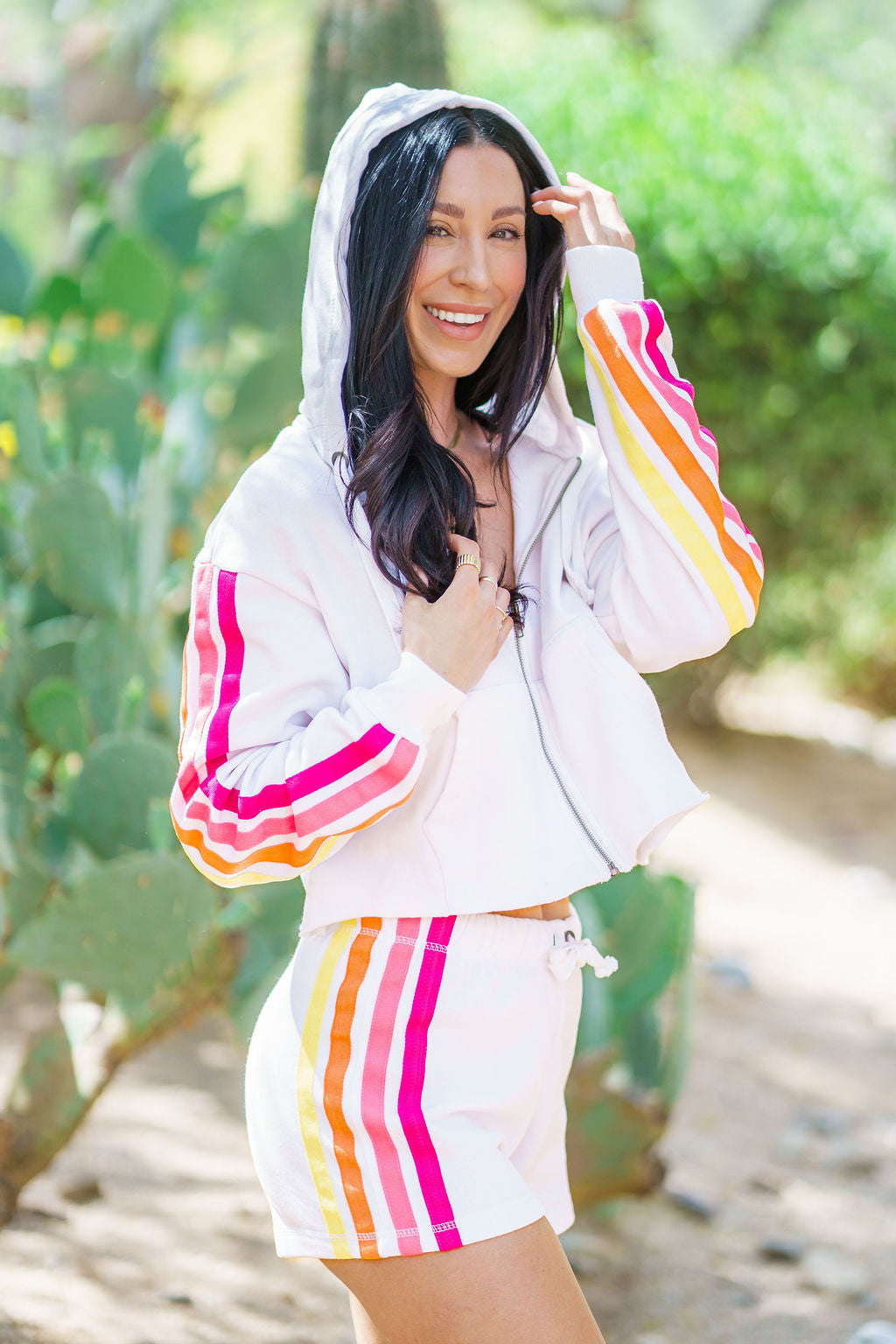 A fresh take on sporty style, this cropped zip hoodie is designed for effortless, everyday wear. Featuring bold colorblock stripe detailing and a flattering, relaxed fit, it’s the perfect lightweight layer for on-the-go moments.
