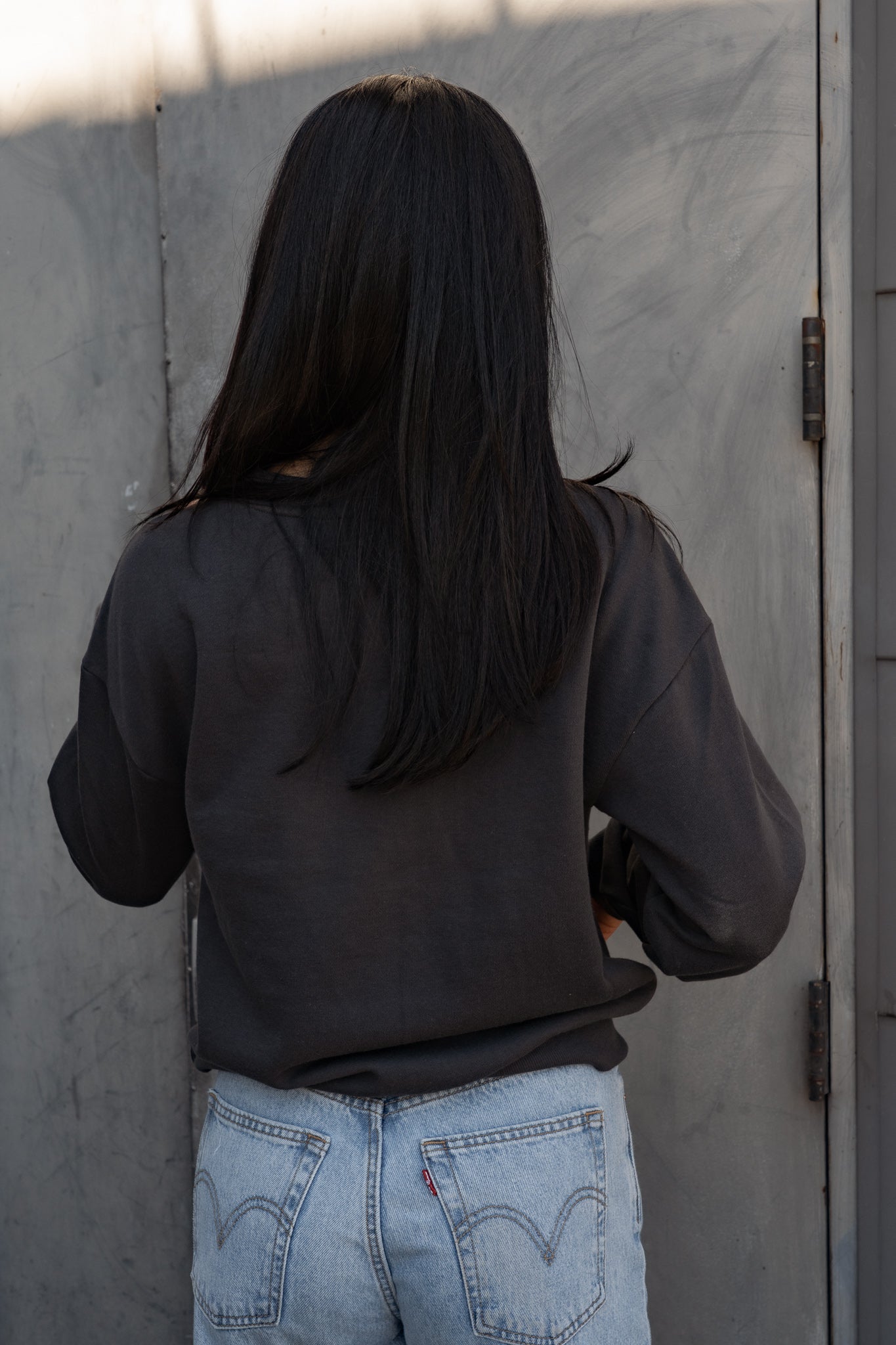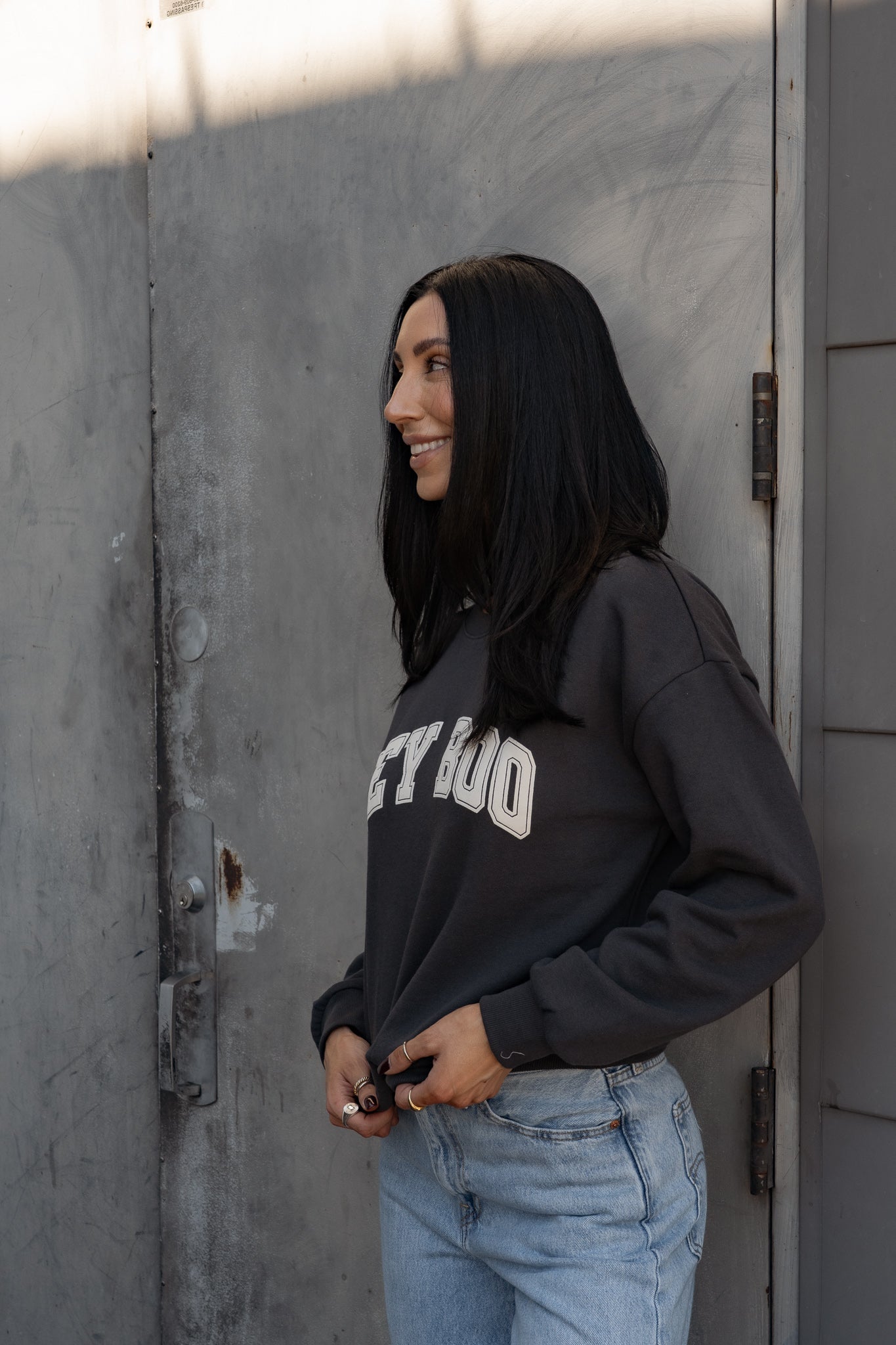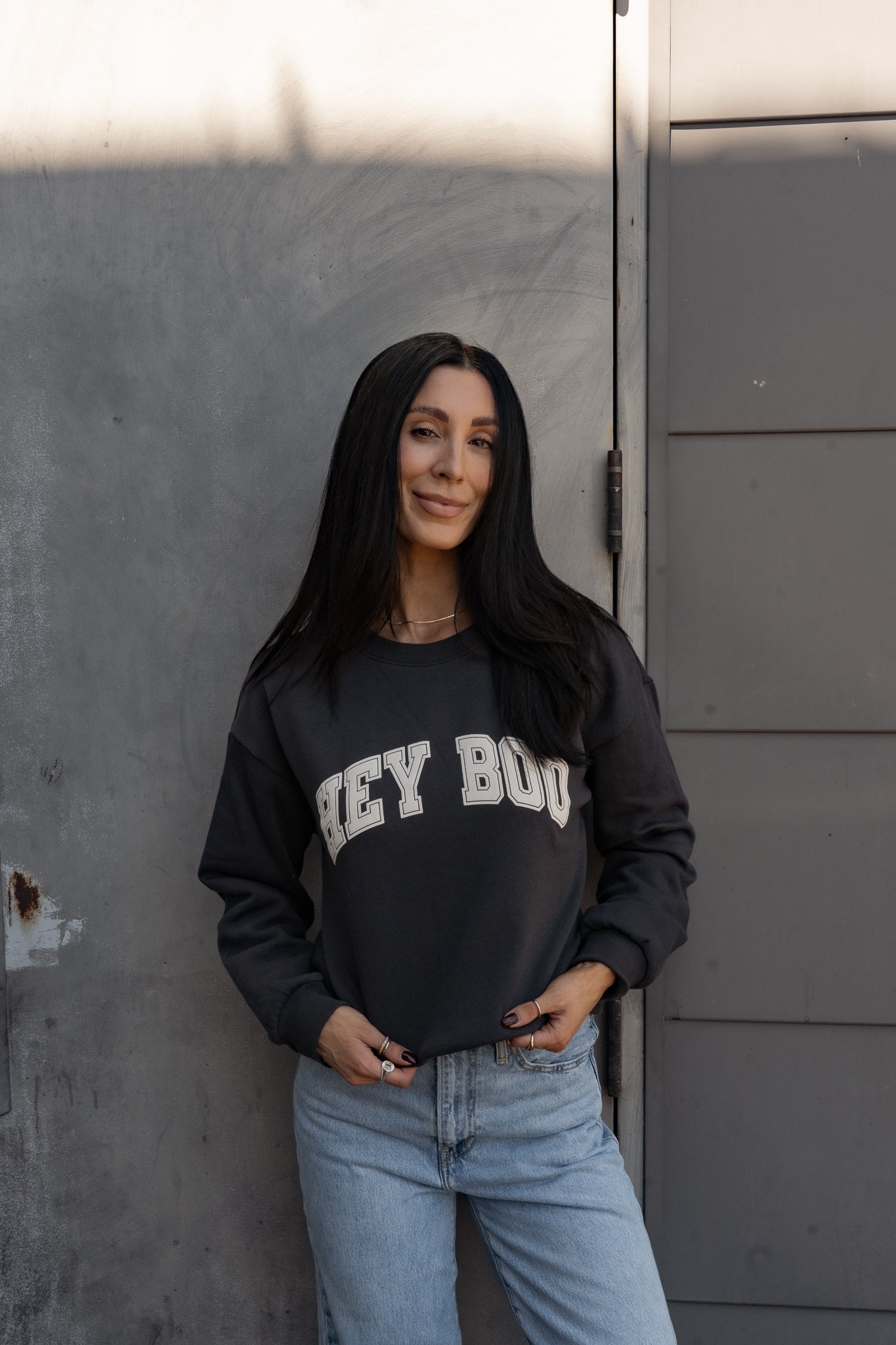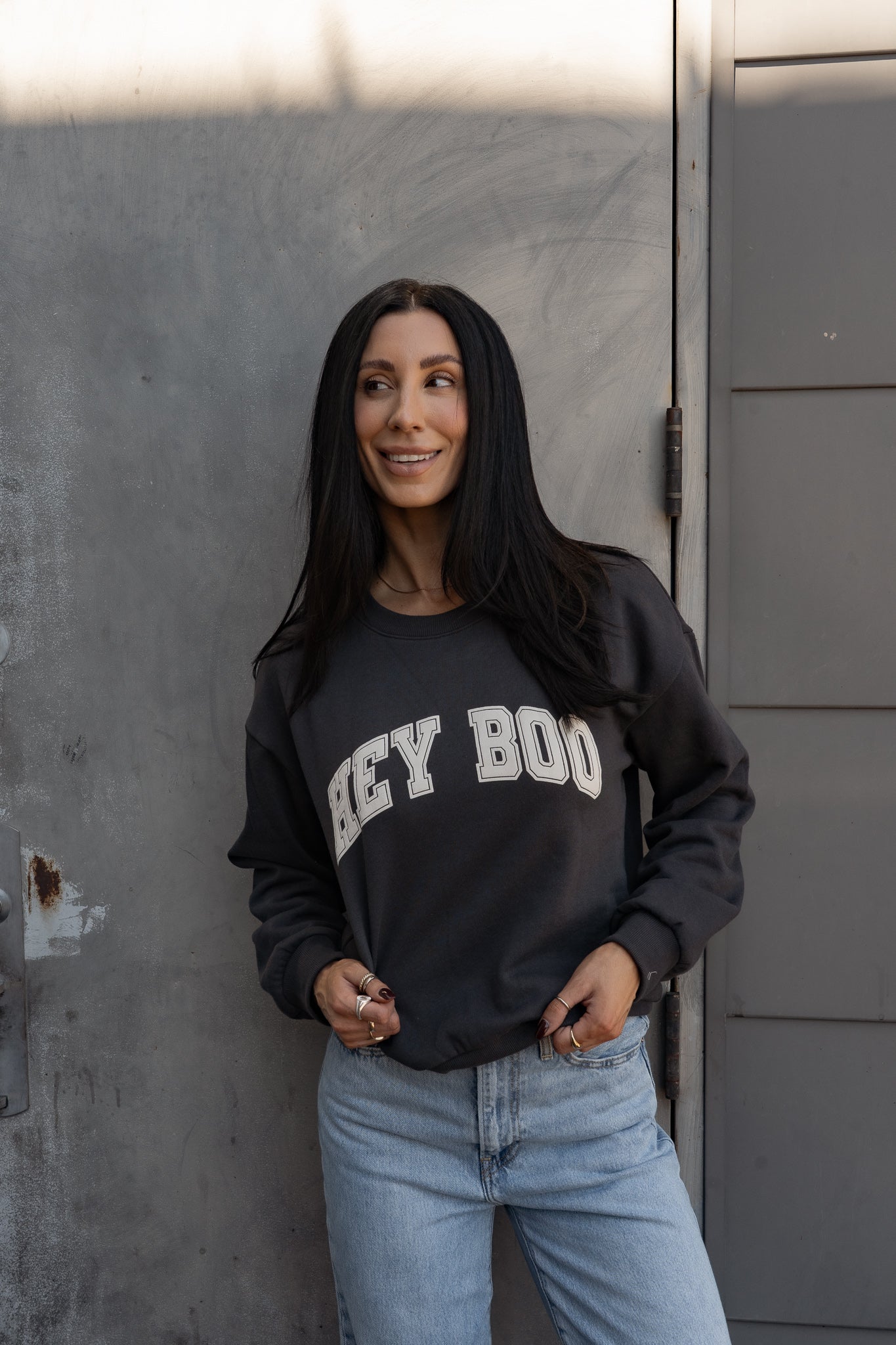 A little flirty, a lot comfy. This cotton fleece crew is washed for a lived-in feel with "hey boo" screen print lettering that makes it perfect for spooky season and beyond.