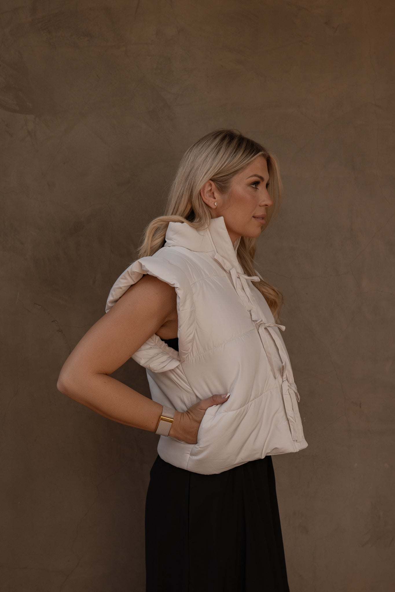 The Puffer With Style Vest gives a feminine update to a classic silhouette. This cropped puffer features a high neck, front bow tie detail, and ruffled shoulders for a touch of charm. Designed with a zip closure and structured shape, it delivers both warmth and polish — perfect for layering through the season.