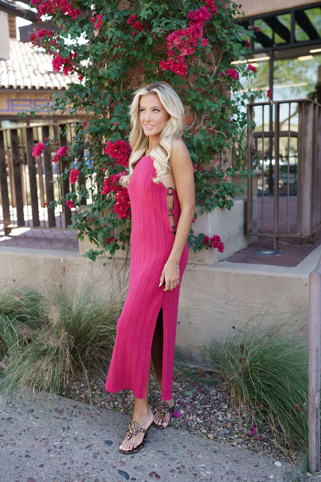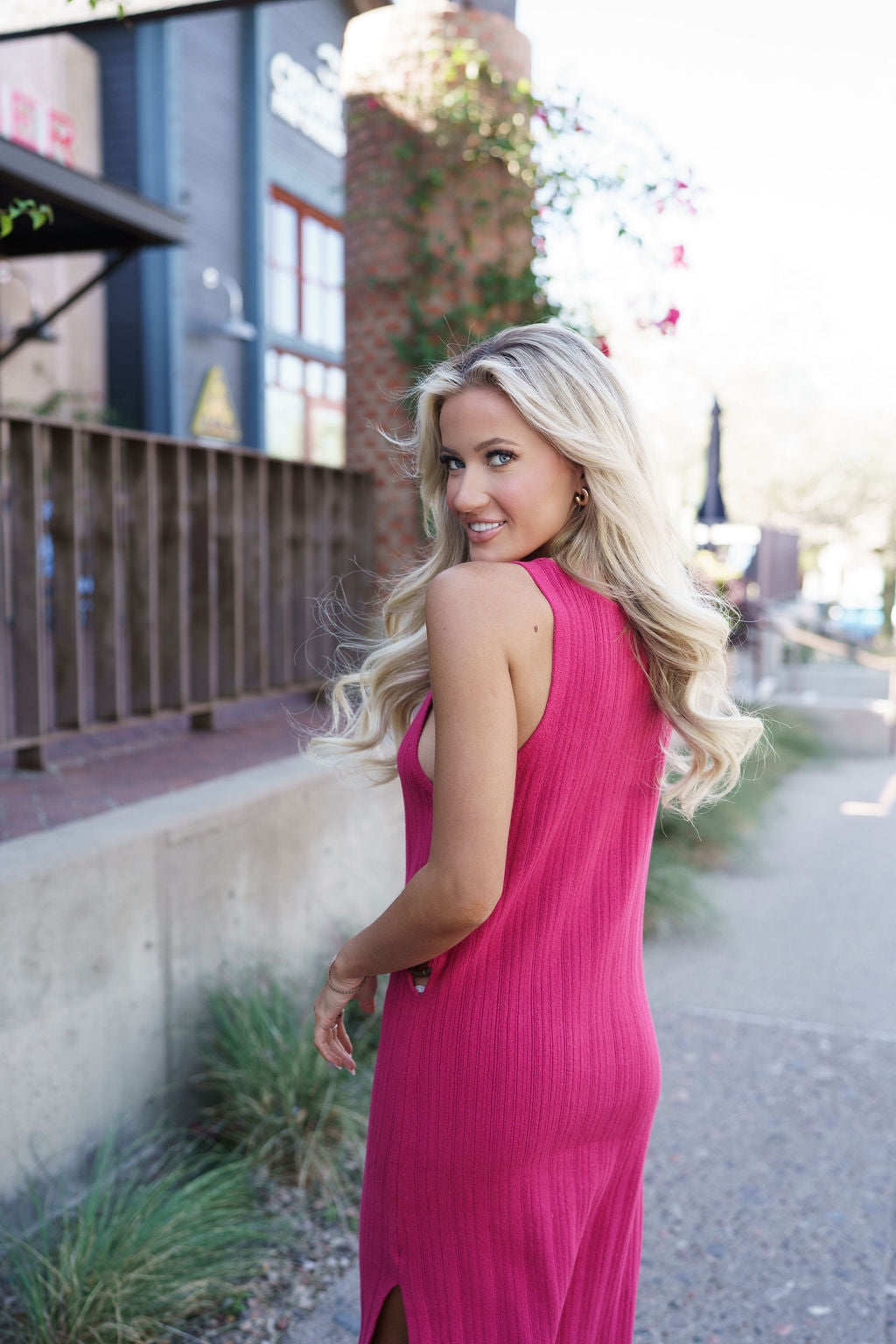 A sleek raspberry ribbed midi dress designed with a sleek, body-skimming fit. This sleeveless style features a classic round neckline and a statement side ring cutout that adds a modern edge.