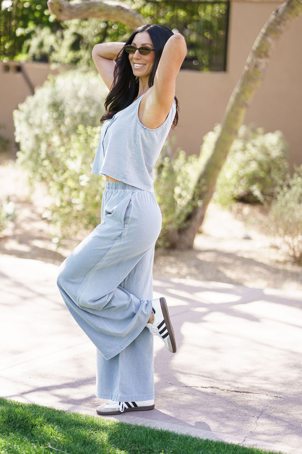 An effortless two-piece set designed for relaxed days and easy styling. The soft washed chambray fabric gives it a lightweight, lived-in feel, while the cropped button tank and flowy wide-leg pants create a flattering, laid-back silhouette.